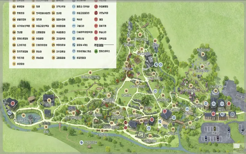 ※ 아침고요수목원 안내도에서 테마정원, 원내매장, 시설 위치, 주차장 위치를 미리 확인 후 방문하시면 수목원을 더욱 편리하게 즐기실 수 있습니다.