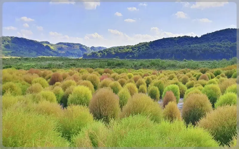 연천 임진강 댑싸리공원의 가장 큰 매력은 계절에 따라 변하는 댑싸리의 아름다움으로, 8월 중순부터 초록색으로 물들기 시작하는 댑싸리는 10월에 붉은빛을 띠며 절정에 달하게 됩니다.